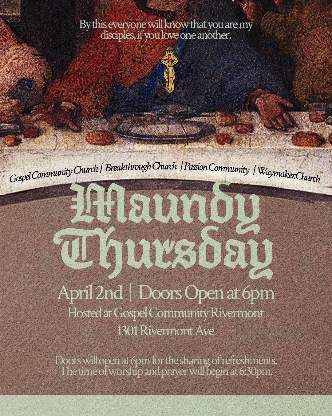 Join us this Maundy Thursday for a shared night of worship, prayer, and communion, as churches like Waymaker, Breakthrough, Passion Community, and Gospel Community gather together in one space to remember Jesus’ love, practice humble presence, and pray for renewal in our city.